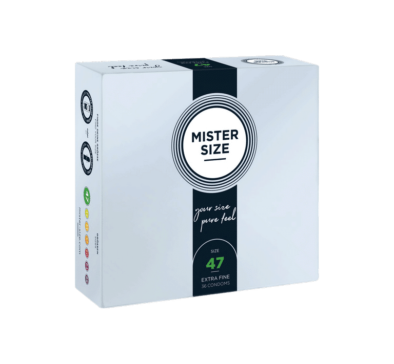 Best geschikt voor de penis met een omtrek tot 10cm (in erectie). Mister Size is de dunnere variant van MySize, een Duits condoommerk dat veel onderzoek heeft gedaan naar condoommaten. Een goed passend condoom is belangrijk voor de veiligheid, maar draagt voor hem ook prettiger. Mister Size 47 zijn ultra dunne condooms (0,05mm dun, voor een optimaal gevoel) met een nominale breedte van 47mm, en een lengte van 160mm. Smallere condooms zitten wat strakker zodat dit condoom niet afglijdt tijdens het vrijen.