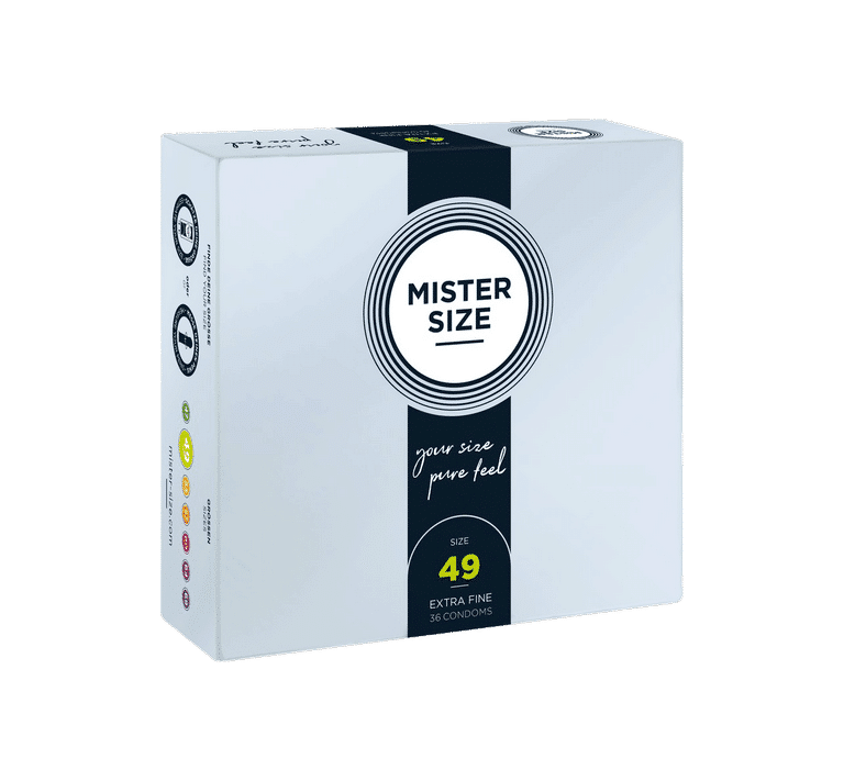Best geschikt voor de penis met een omtrek van 10 tot 11cm (in erectie). Mister Size is de dunnere variant van MySize, een Duits condoommerk dat veel onderzoek heeft gedaan naar condoommaten. Een goed passend condoom is belangrijk voor de veiligheid, maar draagt voor hem ook prettiger. Mister Size 49 zijn ultra dunne condooms (0,05mm dun, voor een optimaal gevoel) met een nominale breedte van 49mm, en een lengte van 165 mm. Smallere condooms zitten wat strakker zodat deze condooms minder snel afglijden tijdens het vrijen.